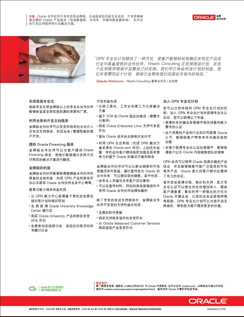 Oracle公司一直非常重視OPN合作伙伴的發(fā)展,并承諾通過(guò)業(yè)務(wù)、市場(chǎng)、培訓(xùn)、解決方案等方面的許多措施,通過(guò)不斷豐富的數(shù)據(jù)庫(kù)、中間件、管理軟件等產(chǎn)品和行業(yè)解決方案,支持合作伙伴的全面成長(zhǎng),并為合作伙伴的業(yè)務(wù)發(fā)展創(chuàng)造更多的機(jī)會(huì)。